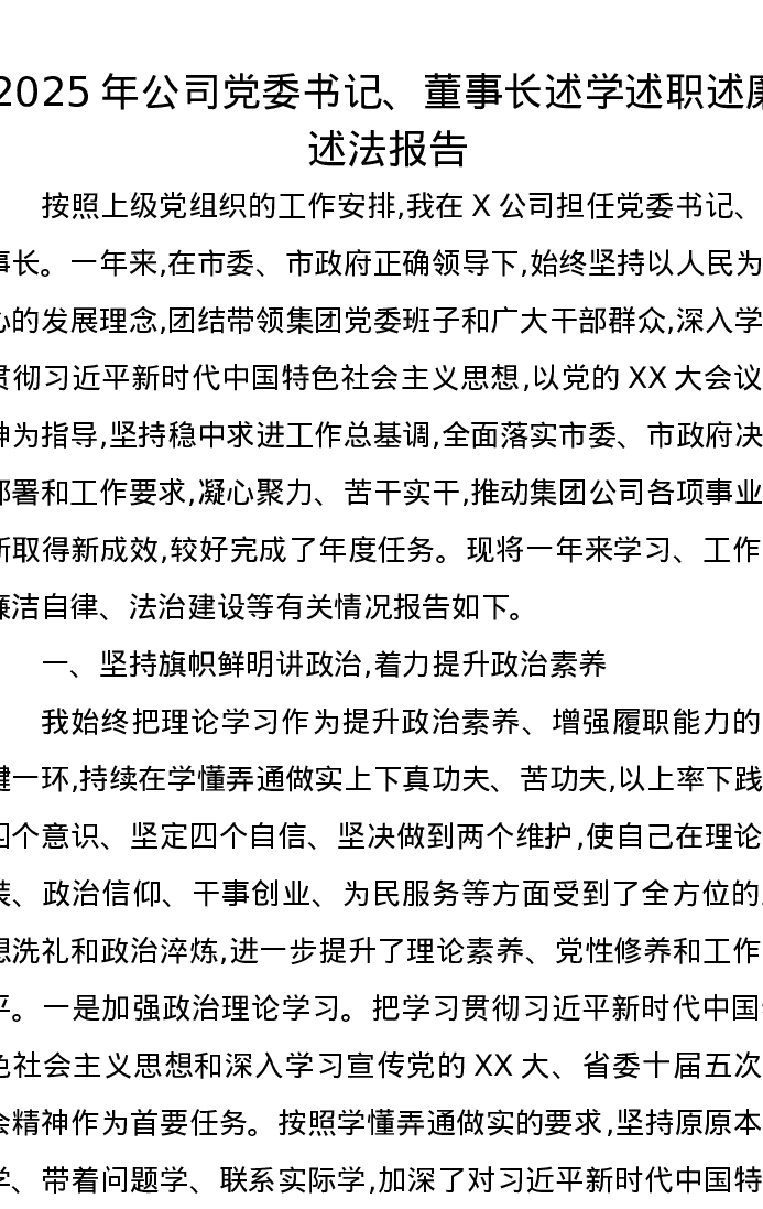2025年公司党委书记、董事长述学述职述廉述法报告