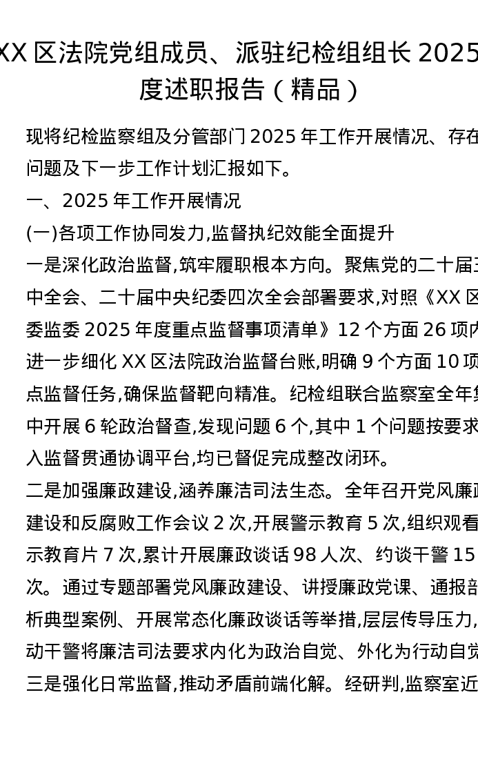 XX区法院党组成员、派驻纪检组组长2025年度述职报告