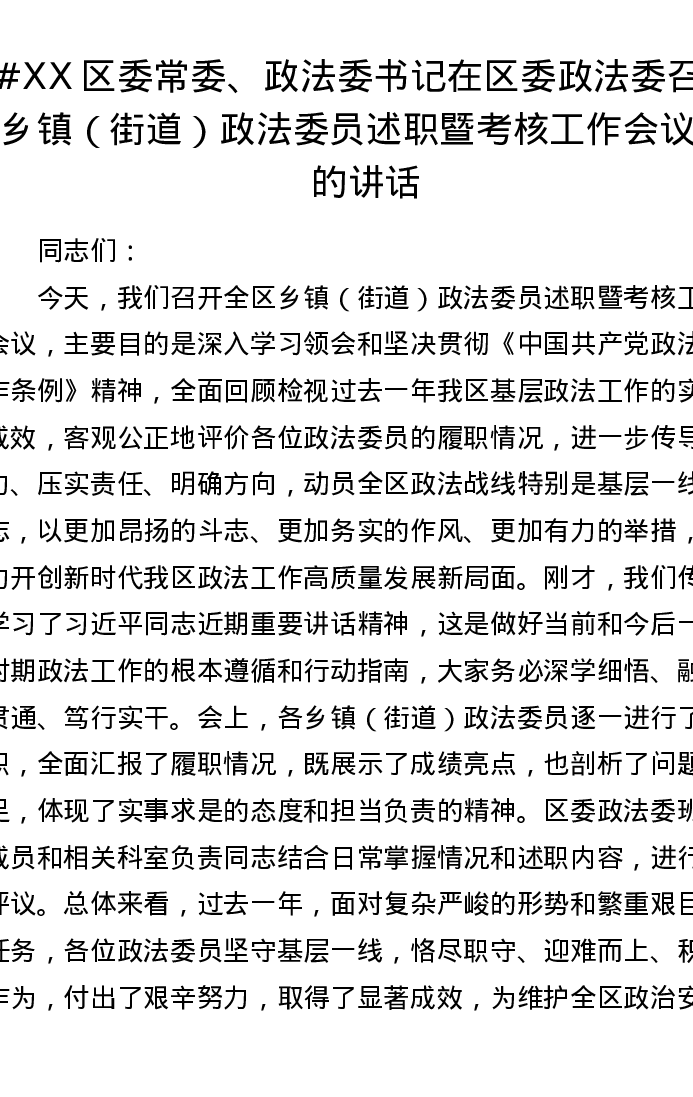 XX区委常委、政法委书记在区委政法委召开乡镇(街道)政法委员述职暨考核工作会议上的讲话2