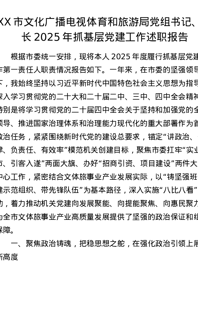 XX市文化广播电视体育和旅游局党组书记、局长2025年抓基层党建工作述职报告