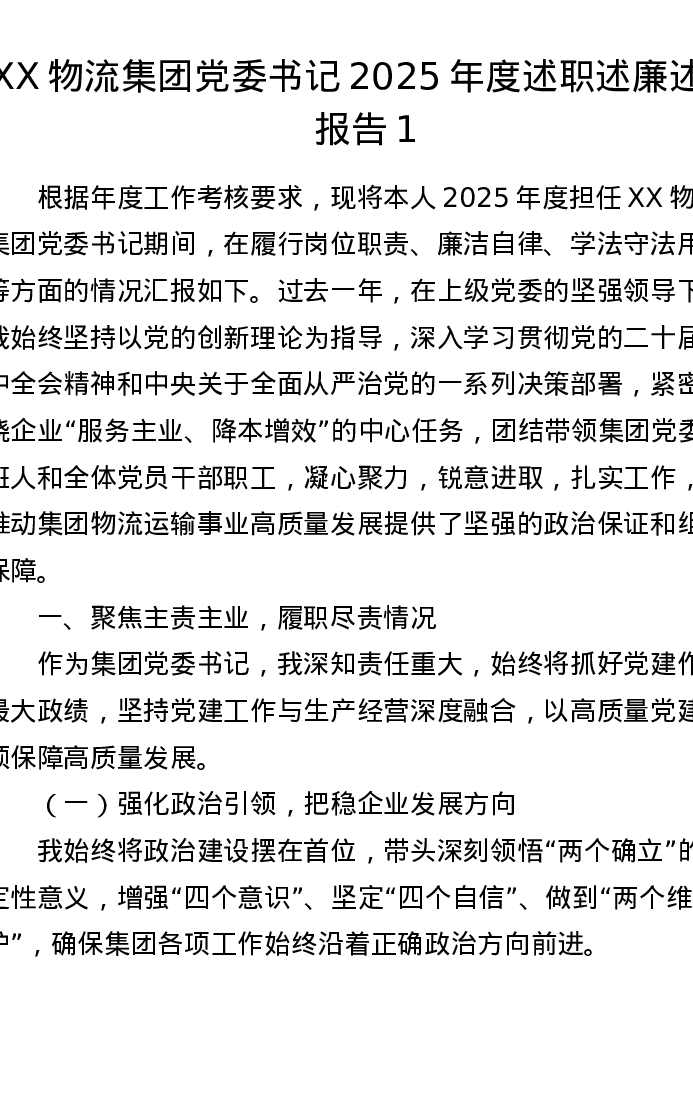 XX物流集团党委书记2025年度述职述廉述法报告1