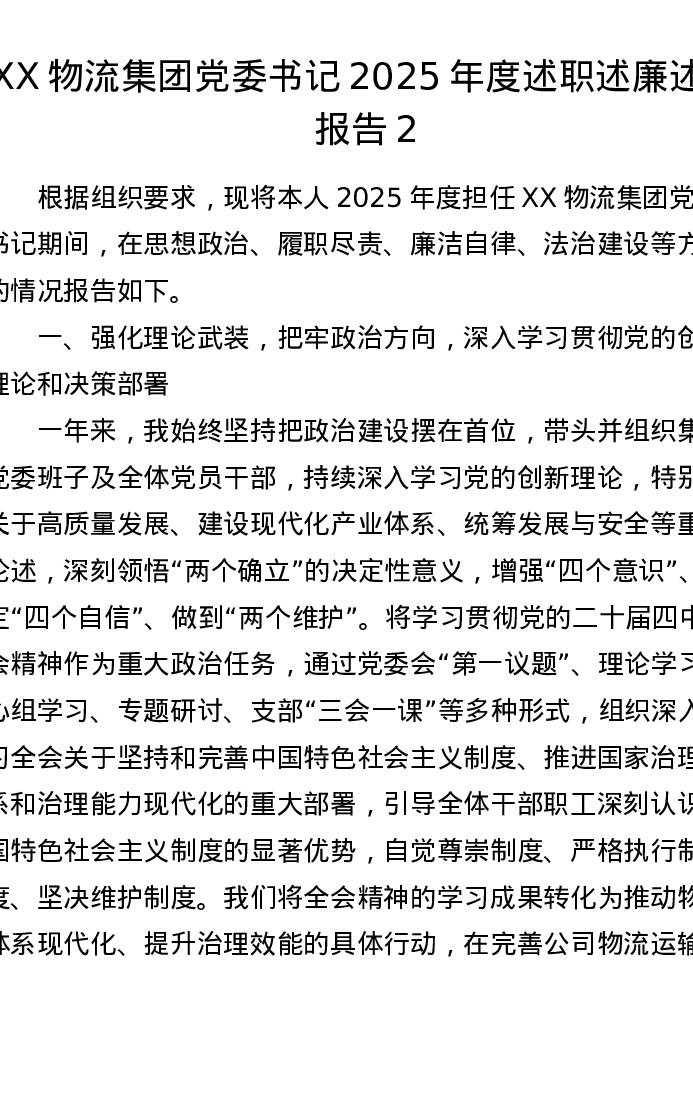 XX物流集团党委书记2025年度述职述廉述法报告2