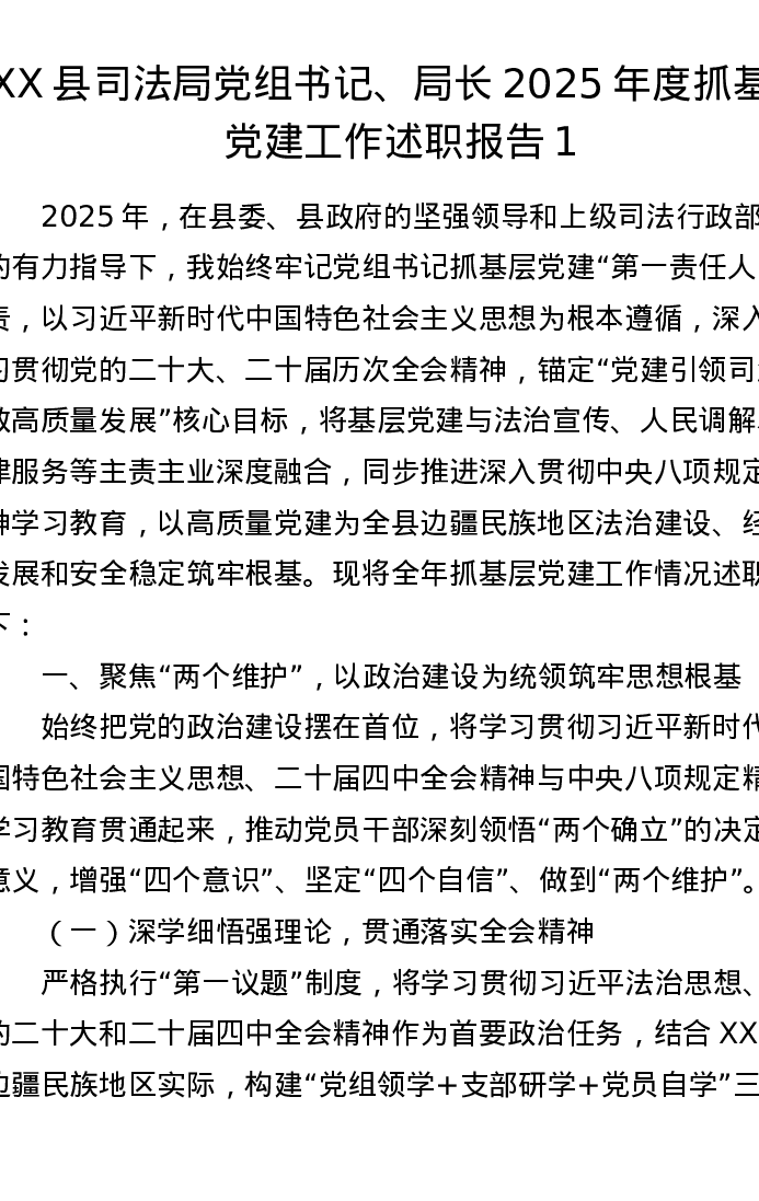 XX县司法局党组书记、局长2025年度抓基层党建工作述职报告1