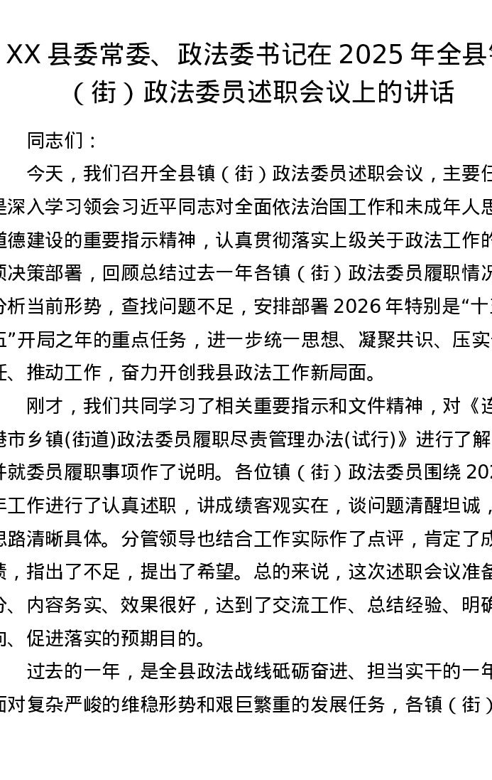 XX县委常委、政法委书记在2025年全县镇(街)政法委员述职会议上的讲话