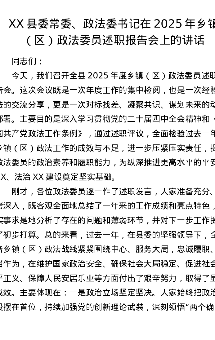 XX县委常委、政法委书记在2025年乡镇(区)政法委员述职报告会上的讲话