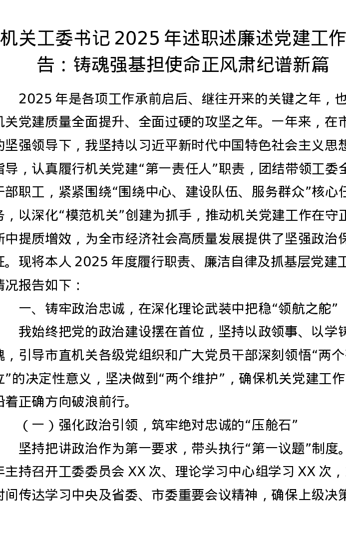 机关工委书记2025年述职述廉述党建工作报告:铸魂强基担使命 正风肃纪谱新篇