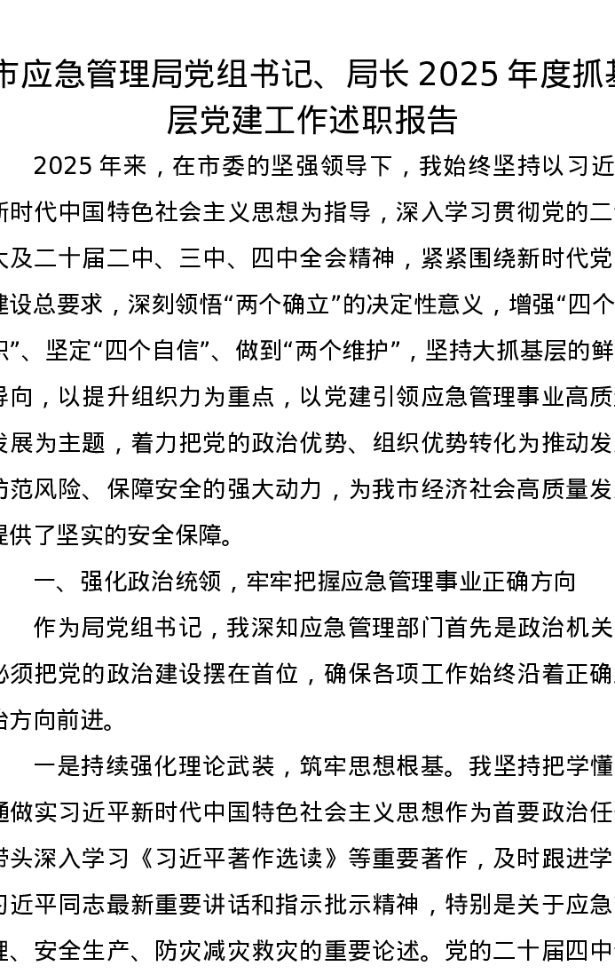 市应急管理局党组书记、局长2025年度抓基层党建工作述职报告