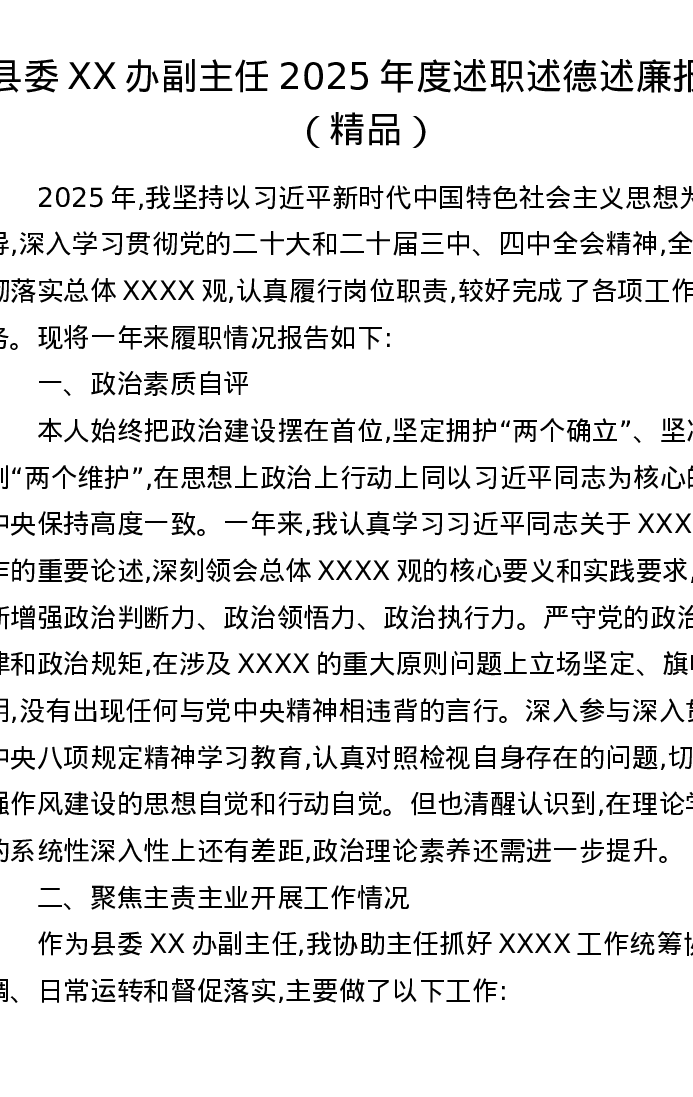 县委XX办副主任2025年度述职述德述廉报告