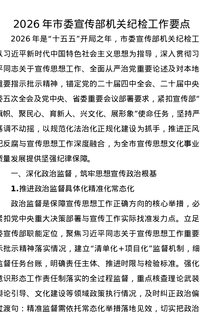 2026年市委宣传部机关纪检工作要点