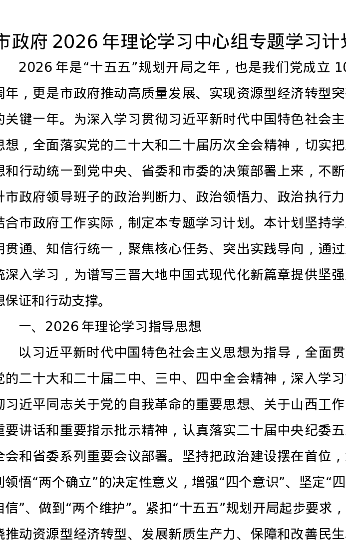 市政府2026年理论学习中心组专题学习计划