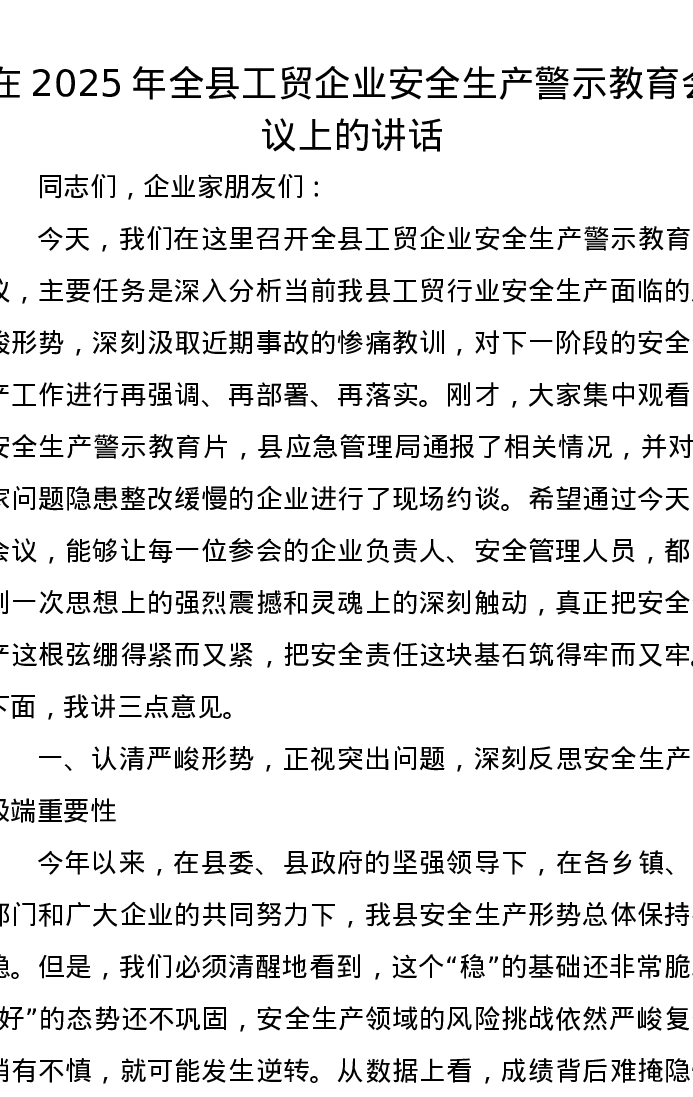 在2025年全县工贸企业安全生产警示教育会议上的讲话