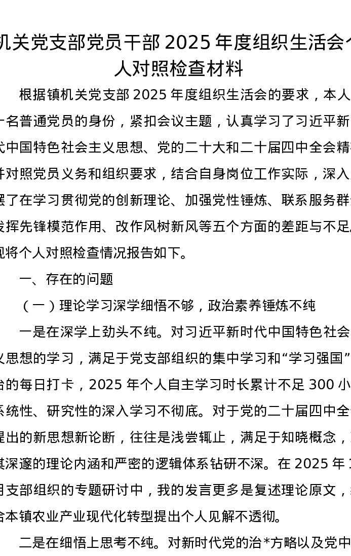 机关党支部党员干部2025年度组织xxx个人对照检查材料