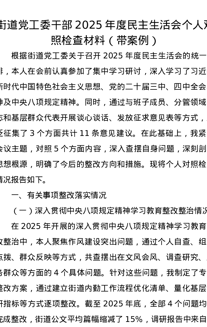 街道党工委干部2025年度xxxxx个人对照检查材料(带案例)