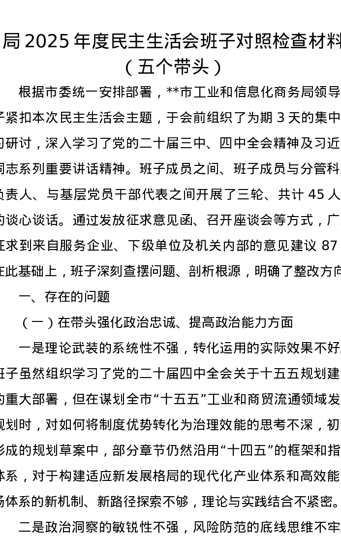 局2025年度xxxxx班子对照检查材料(五个带头)