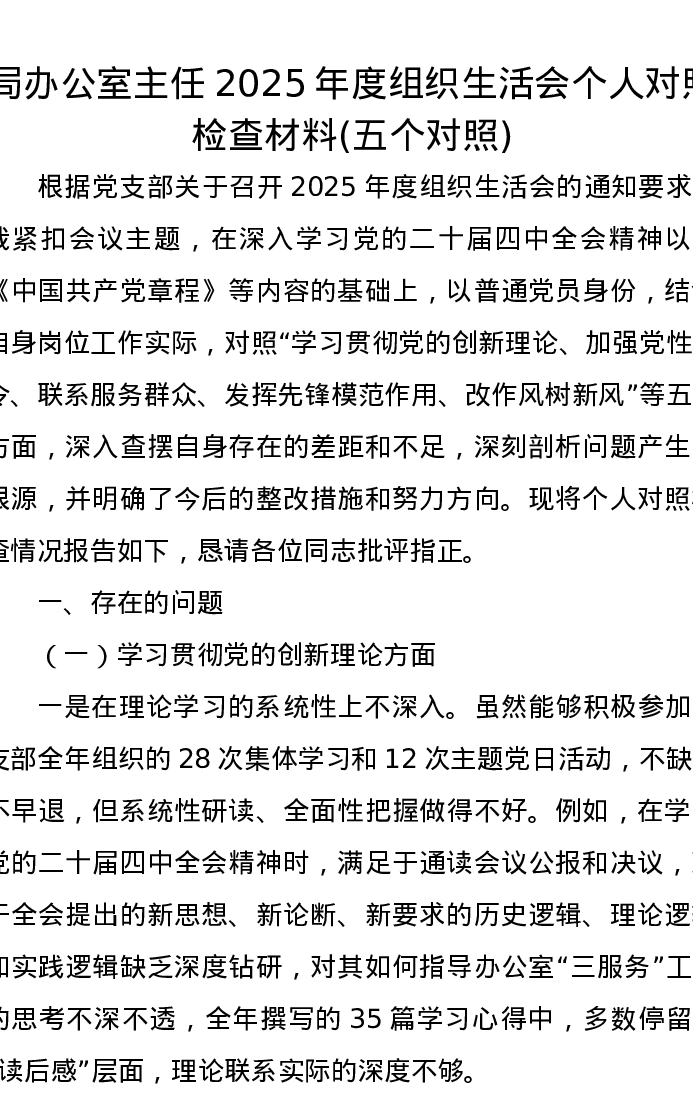 局办公室主任2025年度组织xxx个人对照检查材料(五个对照)