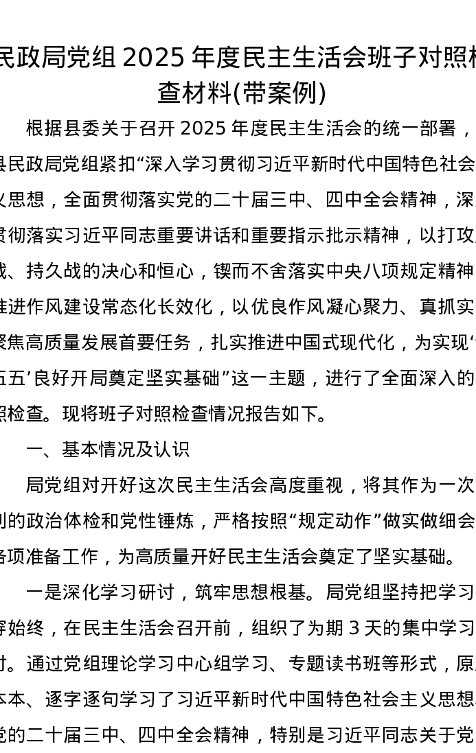 民政局党组2025年度xxxxx班子对照检查材料(带案例)