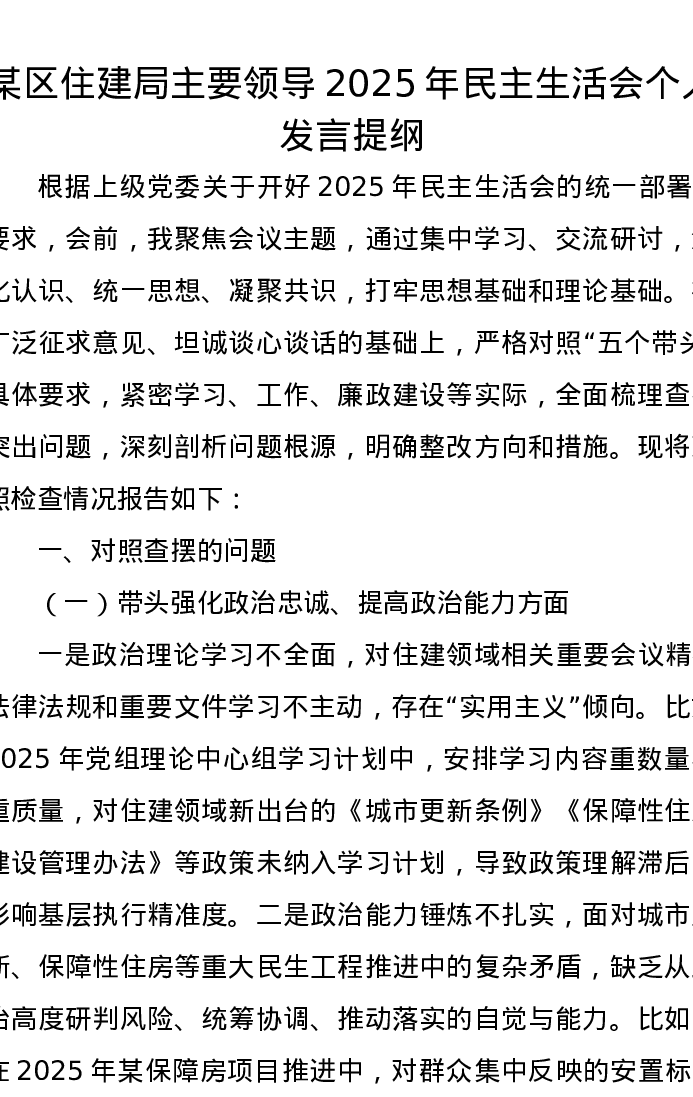 某区住建局主要领导2025年xxxxx个人发言提纲