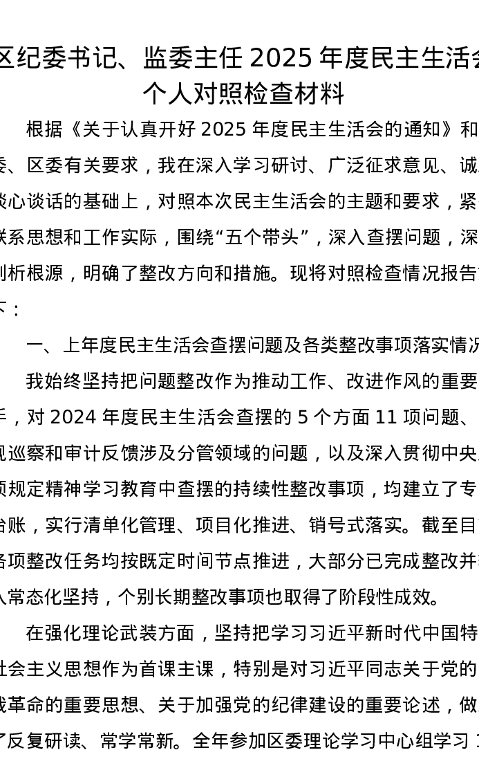 区纪委书记、监委主任2025年度xxxxx个人对照检查材料