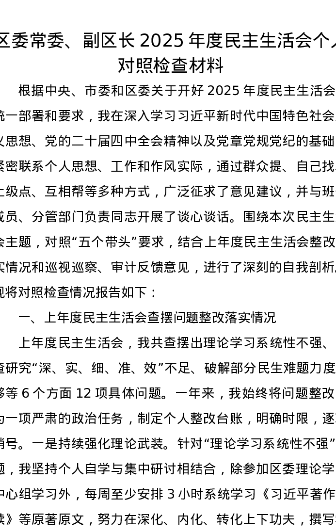 区委常委、副区长2025年度xxxxx个人对照检查材料
