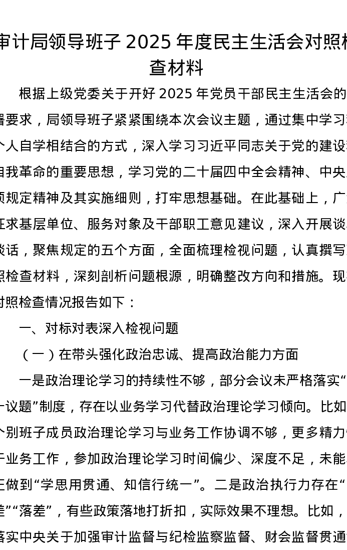 审计局领导班子2025年度xxxxx对照检查材料