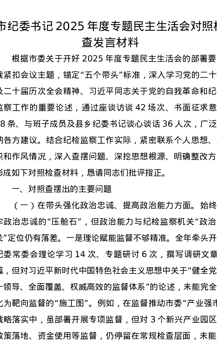 市纪委书记2025年度专题xxxxx对照检查发言材料