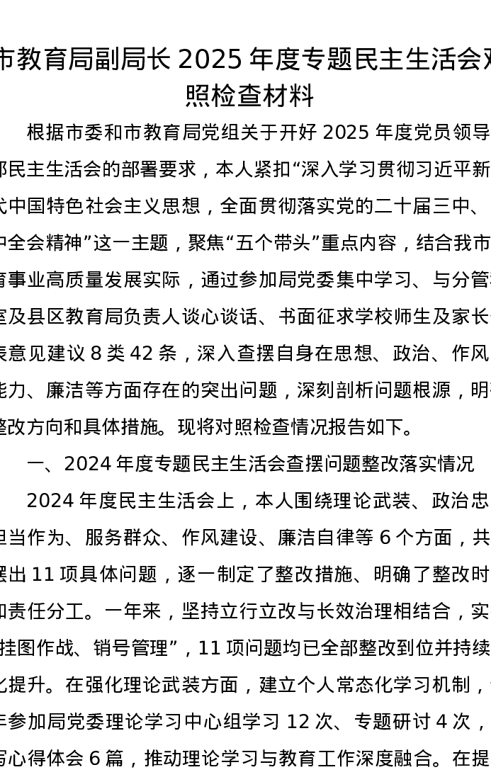 市教育局副局长2025年度专题xxxxx对照检查材料