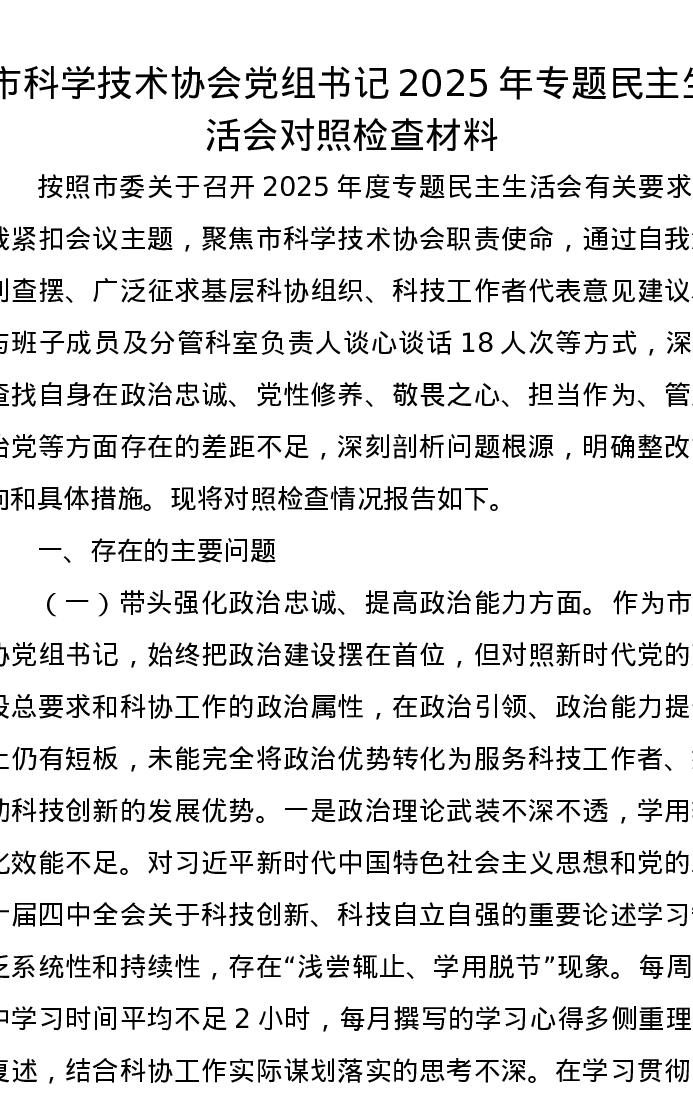 市科学技术协会党组书记2025年专题xxxxx对照检查材料