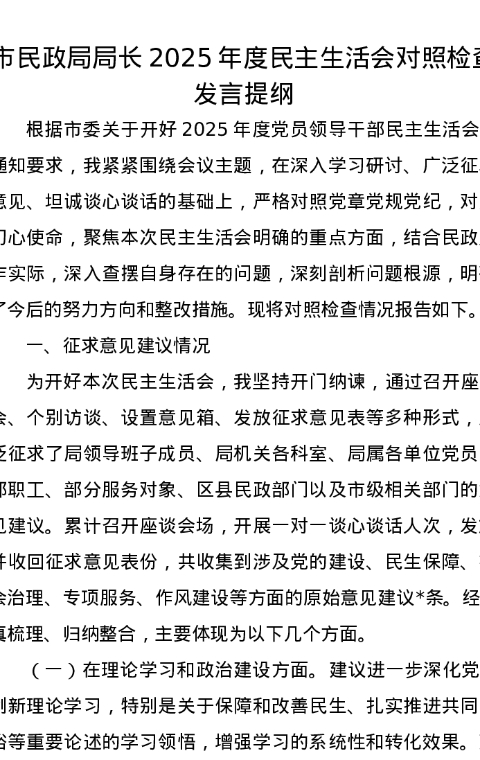 市民政局局长2025年度xxxxx对照检查发言提纲