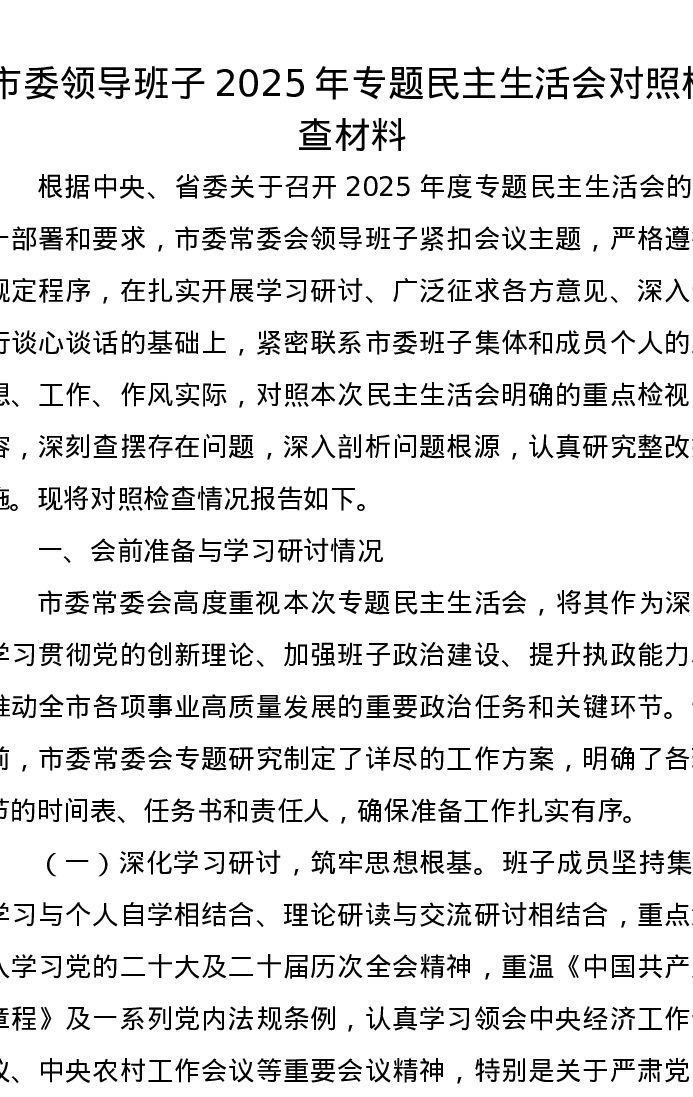 市委领导班子2025年专题xxxxx对照检查材料