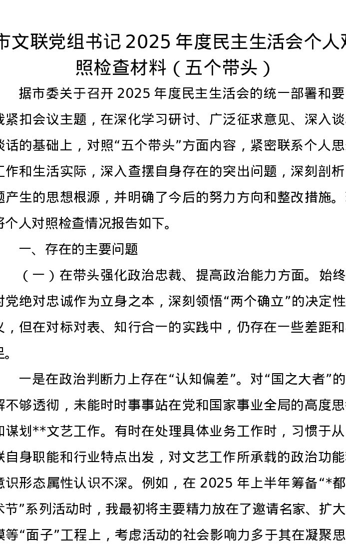 市文联党组书记2025年度xxxxx个人对照检查材料(五个带头)