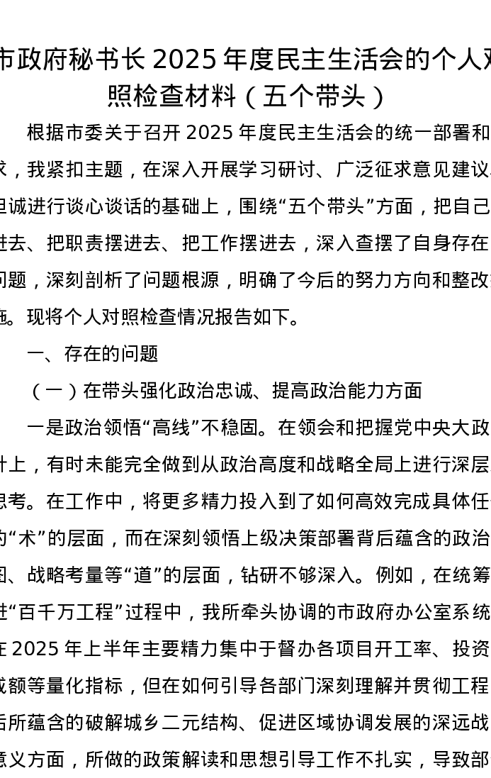 市政府秘书长2025年度xxxxx的个人对照检查材料(五个带头)
