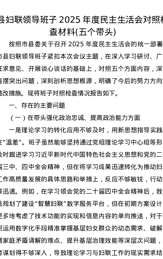县妇联领导班子2025年度xxxxx对照检查材料(五个带头)