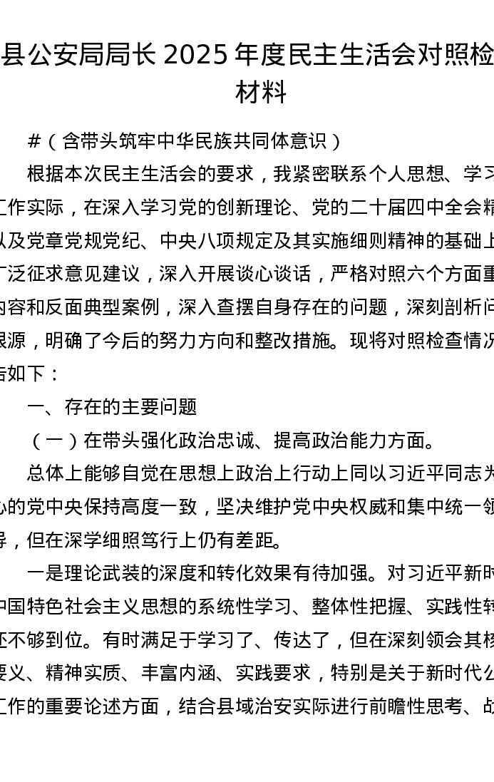 县公安局局长2025年度xxxxx对照检查材料(含带头筑牢中华民族共同体意识)