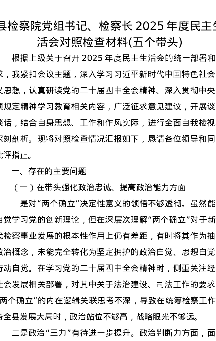 县检察院党组书记、检察长2025年度xxxxx对照检查材料(五个带头)