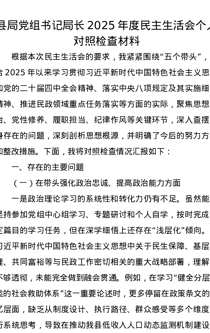 县局党组书记局长2025年度xxxxx个人对照检查材料