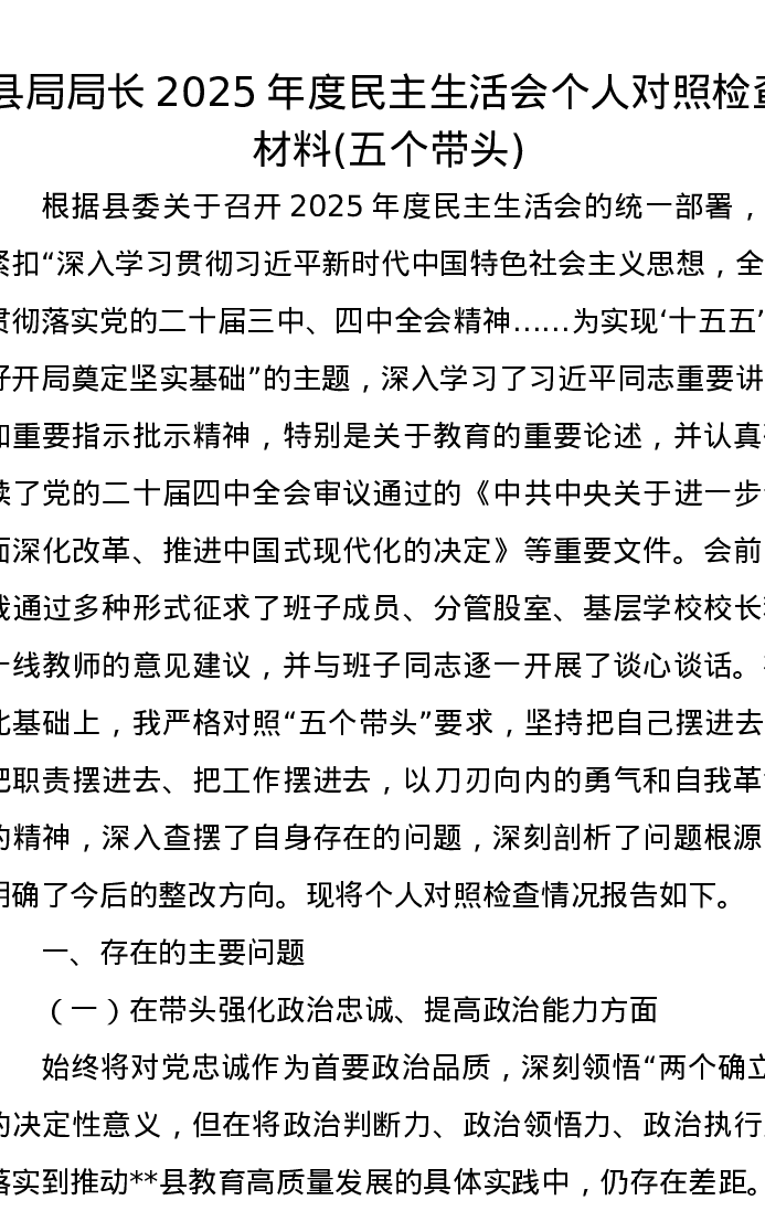 县局局长2025年度xxxxx个人对照检查材料(五个带头)
