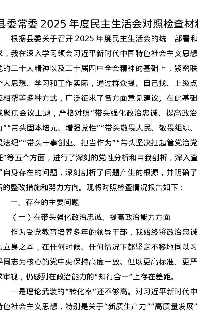 县委常委2025年度xxxxx对照检查材料