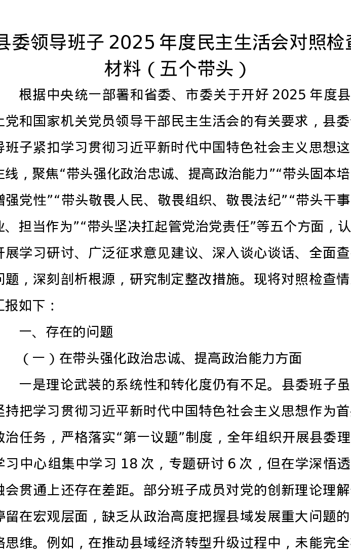 县委领导班子2025年度xxxxx对照检查材料(五个带头)