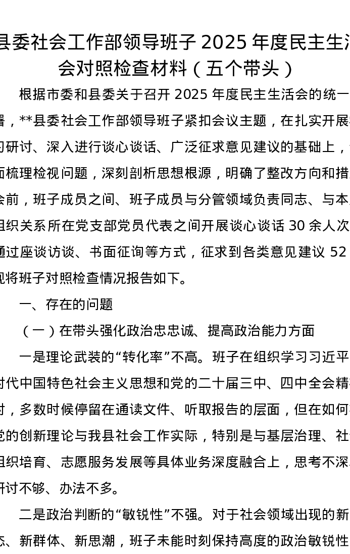 县委社会工作部领导班子2025年度xxxxx对照检查材料(五个带头)