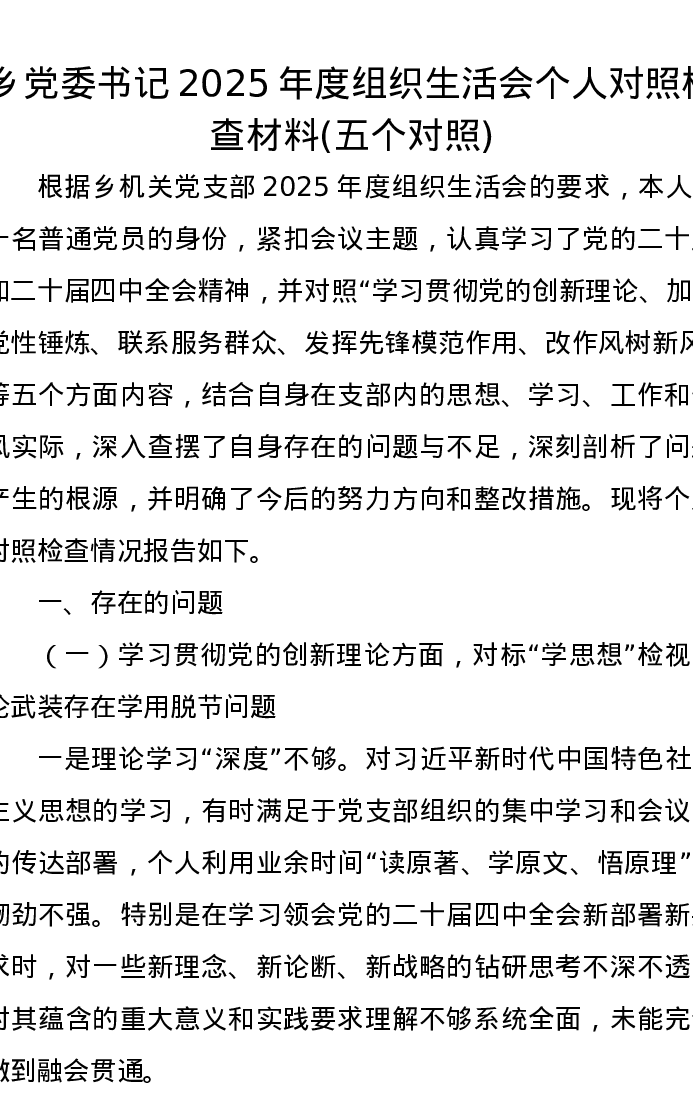 乡党委书记2025年度组织xxx个人对照检查材料(五个对照)