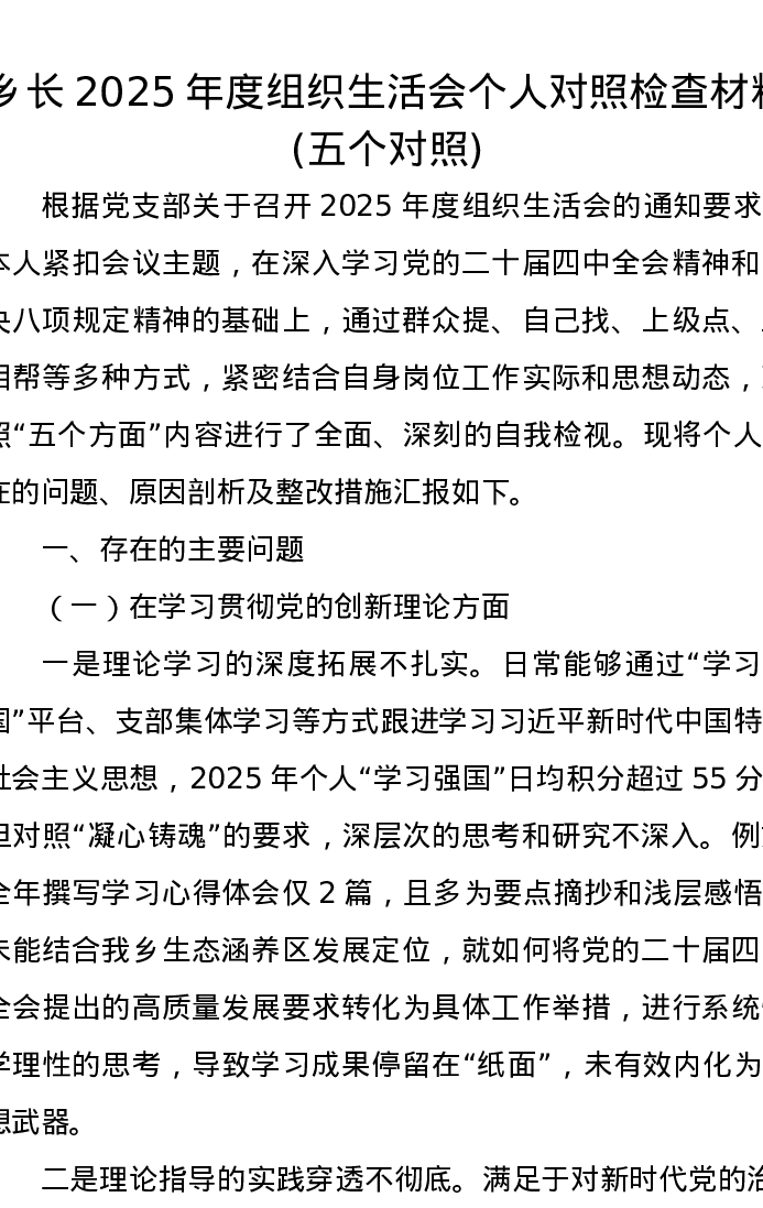 乡长2025年度组织xxx个人对照检查材料(五个对照)