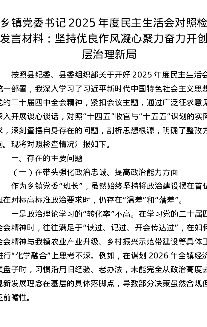 乡镇党委书记2025年度xxxxx对照检查发言材料:坚持优良作风凝心聚力 奋力开创基层治理新局
