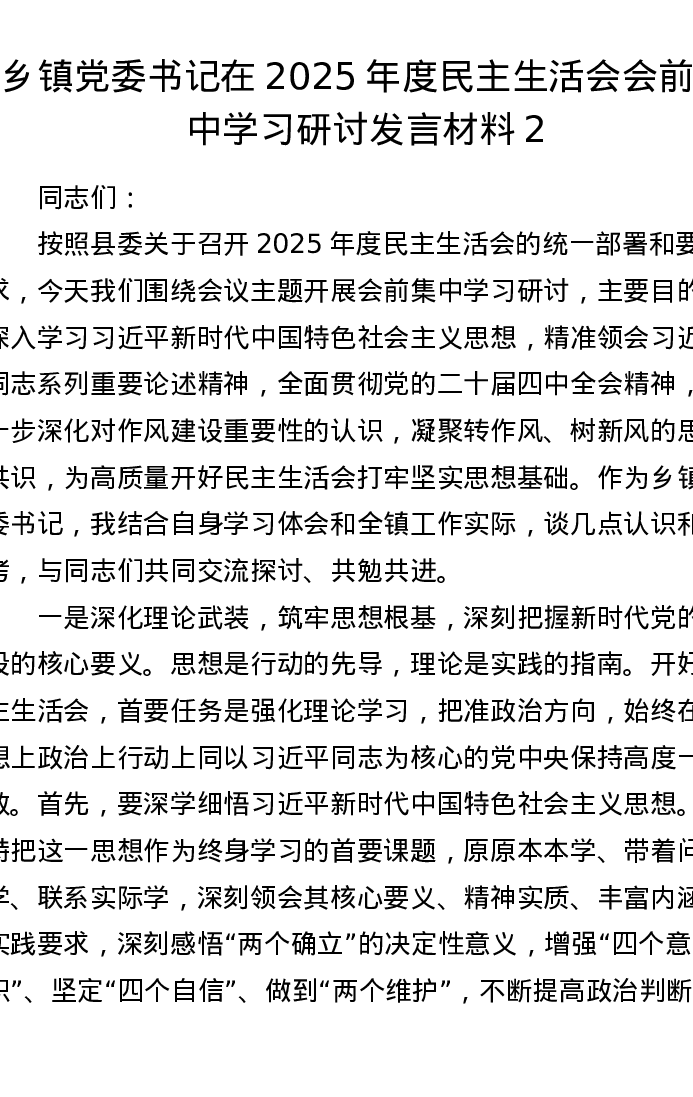 乡镇党委书记在2025年度xxxxx会前集中学习研讨发言材料2