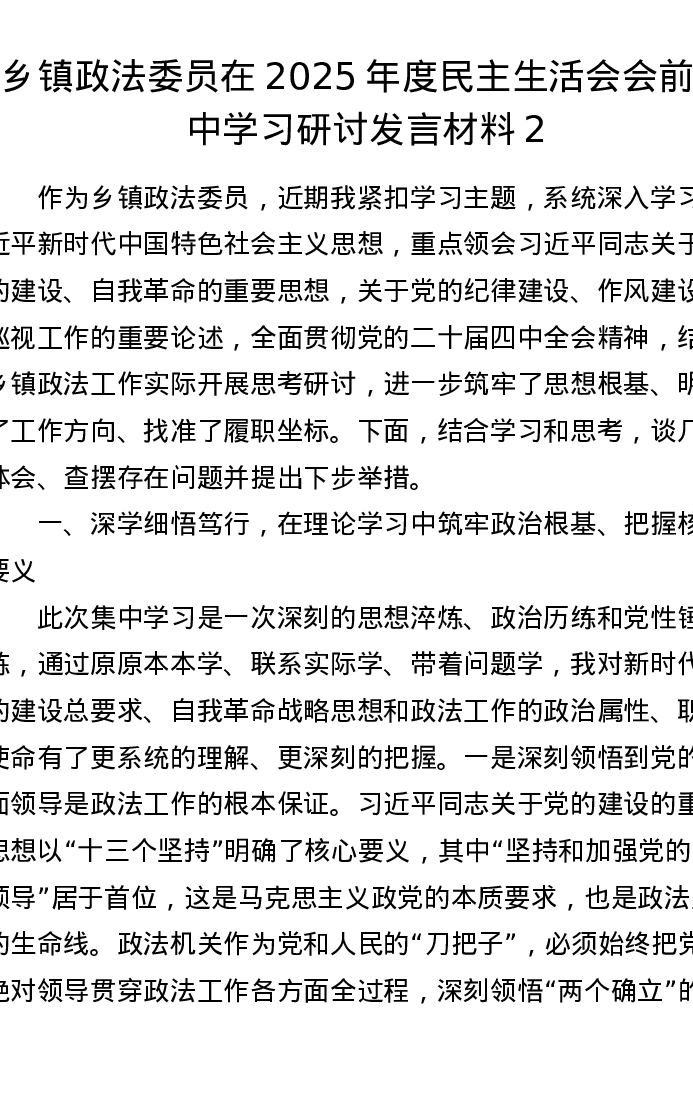 乡镇政法委员在2025年度xxxxx会前集中学习研讨发言材料2