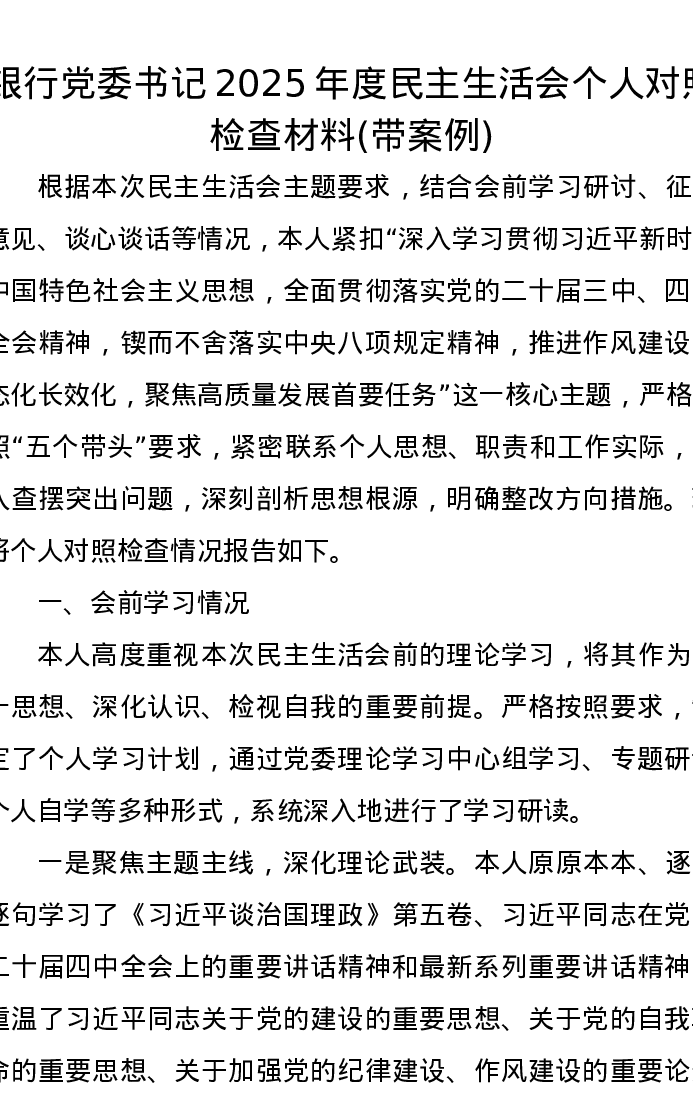 银行党委书记2025年度xxxxx个人对照检查材料(带案例)