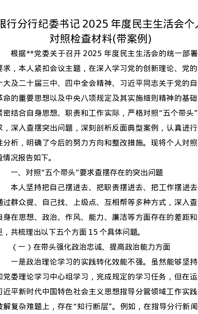 银行分行纪委书记2025年度xxxxx个人对照检查材料(带案例)