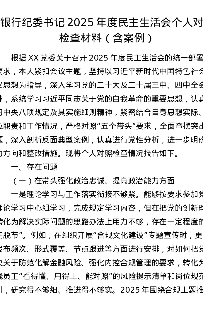 银行纪委书记2025年度xxxxx个人对照检查材料(含案例)