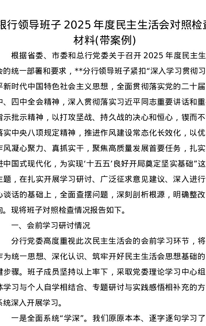 银行领导班子2025年度xxxxx对照检查材料(带案例)