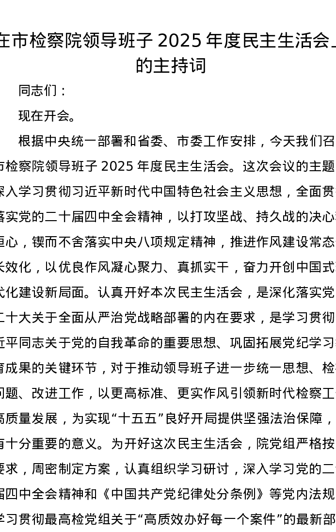 在市检察院领导班子2025年度xxxxx上的主持词