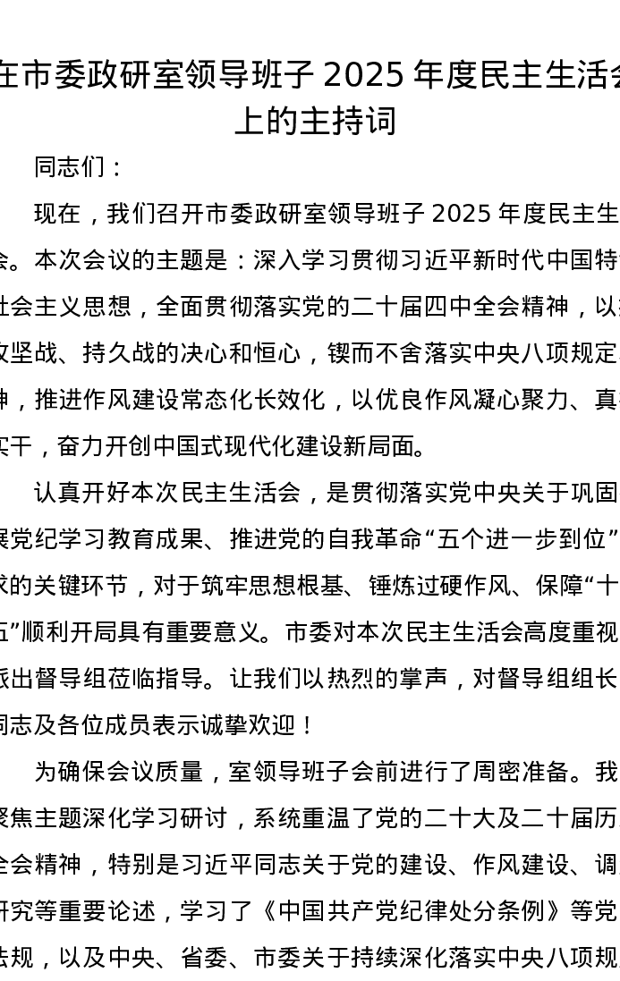 在市委政研室领导班子2025年度xxxxx上的主持词